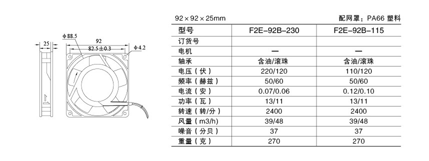 F2E-92S/B-230/115 轴流含油/滚珠电动散热风机,工作温度范围在 -10°C to +55°C ,风量39/48 m3/h,噪音水平(分贝)